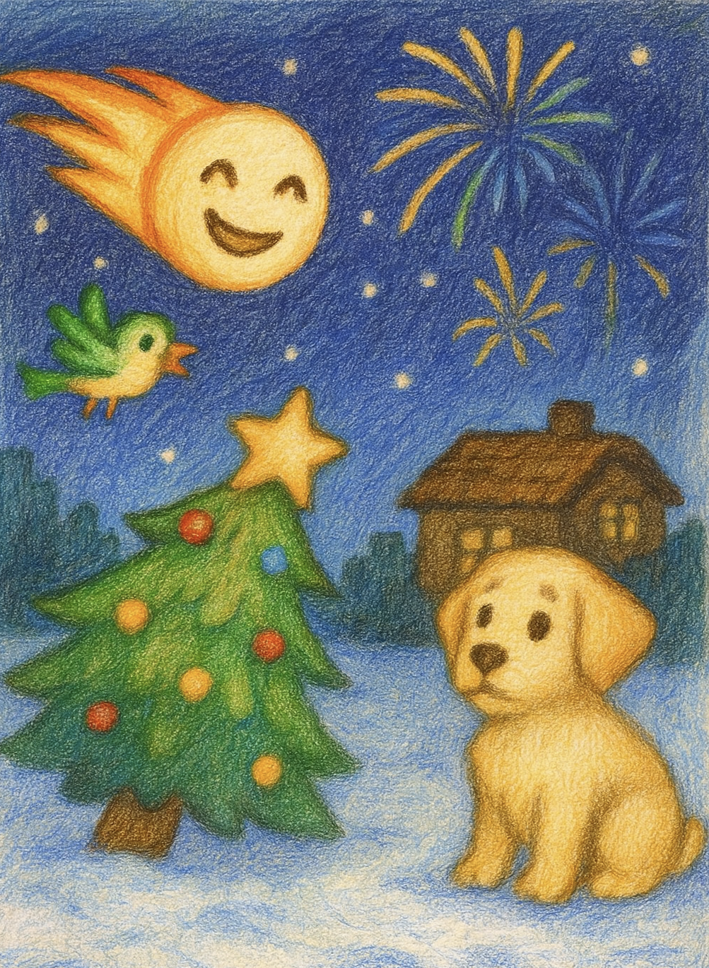 Když se tatínek ohnal , tak se usadila na zádech Montyho a prohlásila, že tady má nového bodyguarda a Monty se zatvářil hrdě jako největší ochránce všech ptáčků na světě před lidma , které máchají rukama, jakoby chtěli snad Andulku plesknout. Teo, Niki i Eli měli nejveselejší Vánoce na světě. A kometka letěla zpátky do vesmíru, aby to vypravovala všem hvězdičkám, stříbrnému měsíci a zlatému sluníčku a sněhovým mráčkům, aby měli taky veselo. A mraky se tak chechtaly, až se z toho třásly a začaly ze sebe sypat malé vločky a bylo jich tolik, že za chvilku byla v městečku všude bílá peřina. Všechno to vypadalo jako babičky pocukrovaná bábovka.